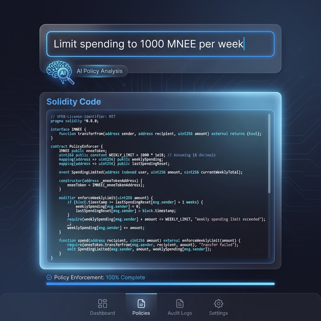 Stop writing complex smart contract logic. Simply describe your spending rules in plain English, and Aegis translates them into on-chain guardrails instantly.